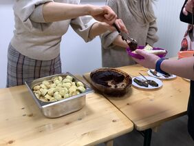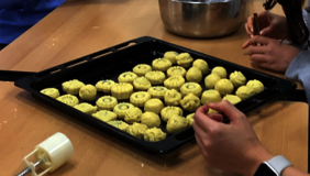 In gemütlicher Atmosphäre wurde gemeinsam gekocht, probiert und anschließend zusammen gegessen. Auf dem Speiseplan standen vier internationale Gerichte, die unterschiedlicher kaum sein konnten und dennoch wunderbar zusammenpassten: Kartoffelsalat Olivier, Maamoul (Dattelkekse), Börek und Samosas.